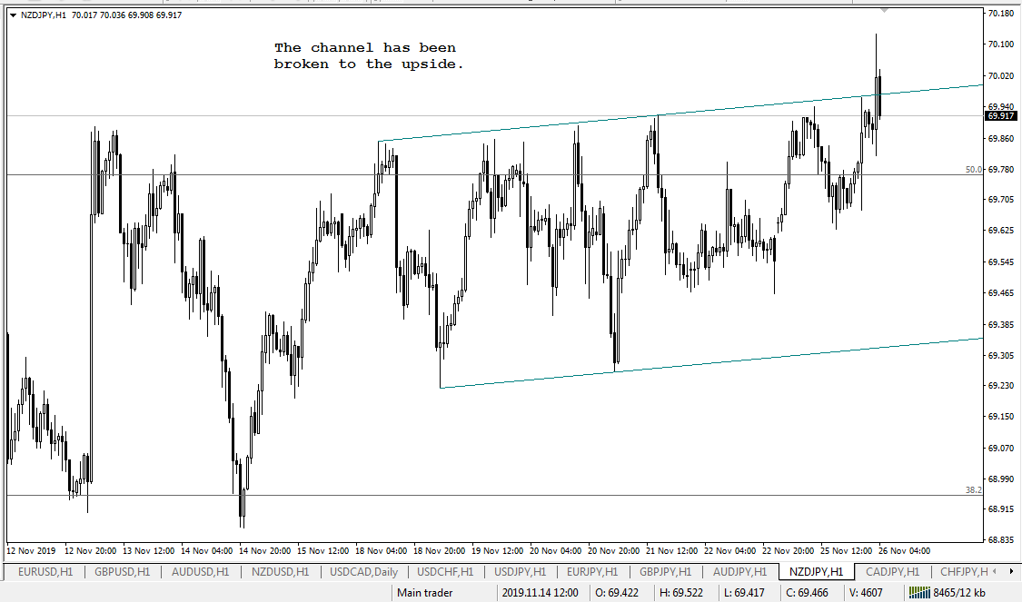 In last hour, the US and China reached consensus on phase 1, which caused NZD/JPY to break the channel on H1.